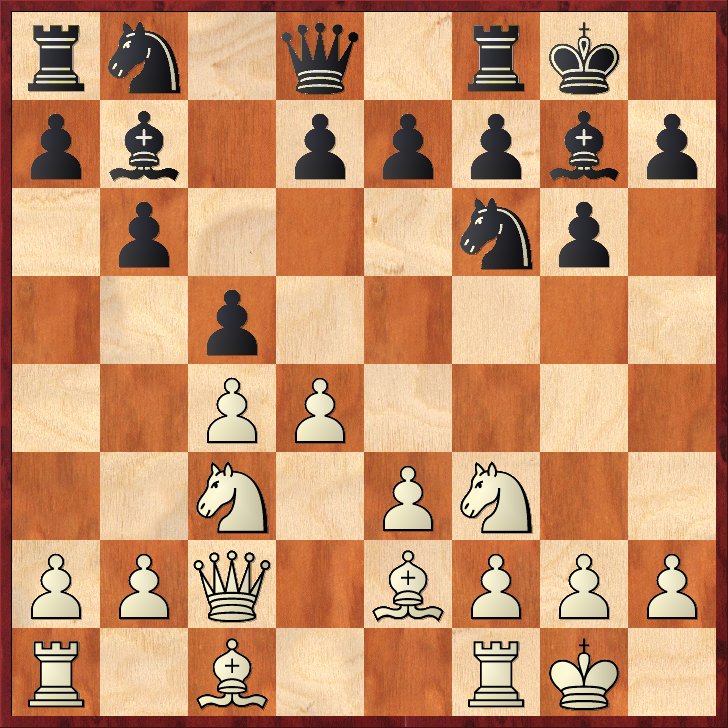 12.Lb3 Lb7 13.a3 Tc8 14.La2 Sa5 15.Se5 Sd5 16.Sxd5 Lxd5 17.b4 Sc4 18.Sxc4 Lxc4 19.Te1 Dd5 20.Dd2 Tfd8 21.Lxc4 Txc4 22.Tac1 e5