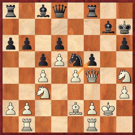 23…Txf5? (Lxf5! widerlegt mein Lh5!)  24.exf5 Lxf5 25.Dg3  mit Remisangebot, welches mein Gegenüber aber schnell ablehnte. Lf6 26.Lg4 Lh4  Eine spannende Stellung!.  27.Lxf5+ Txf5 28.De3 Tf3!