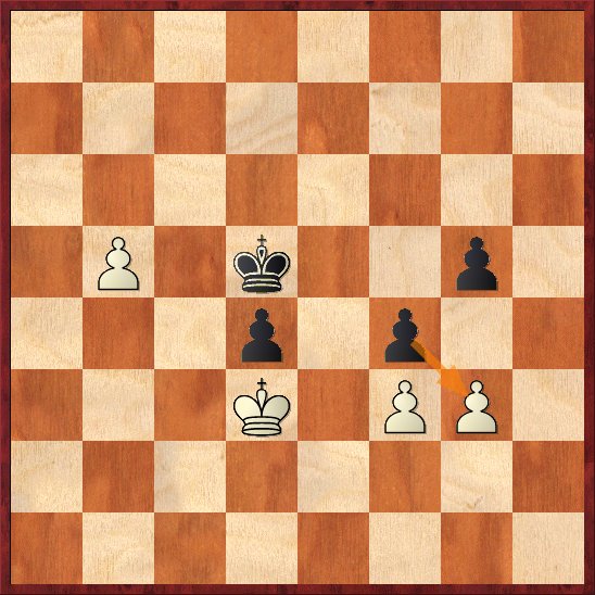 Es geschah: 49.g4 Kc5 50.b6 Kxb6 51.Kxd4 Kb5 52.Kd5 Kb4 53.Ke5 Kc4 54.Kf5 Kd4 55.Kxg5 Ke3 56.Kh4 Kxf3 57.g5 Ke2 58.g6 f3 59.g7 f2 ½-½
