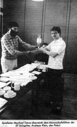 Die Umfrage konnte ich leider nicht erstellen, weil es sich bei den Abgebildeten nicht nur um SVGler handelt. Die falschen Bärte und Retrobrillen sahen natürlich im Original ganz anders aus, denn es handelt sich ja hier um einen Scan einer Seite aus einer Rochade aus den neunziger Jahren, da ging einiges an Detailtreue verloren. Zum Glück :) Das Rätsel des Koffers und des unsichtbaren Dritten kann ich aber auflösen. Die Pokalübergabe ereignete sich im Rahmen des NSV-Kongresses am 10. August 1991. Daher überrascht auch der Koffer nicht so sehr, der in diesem Fall im übrigen dem damaligen NSV-Pressewart Claudio Mertz gehört.